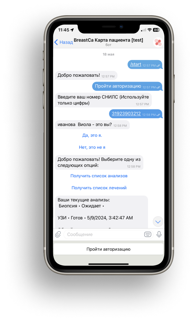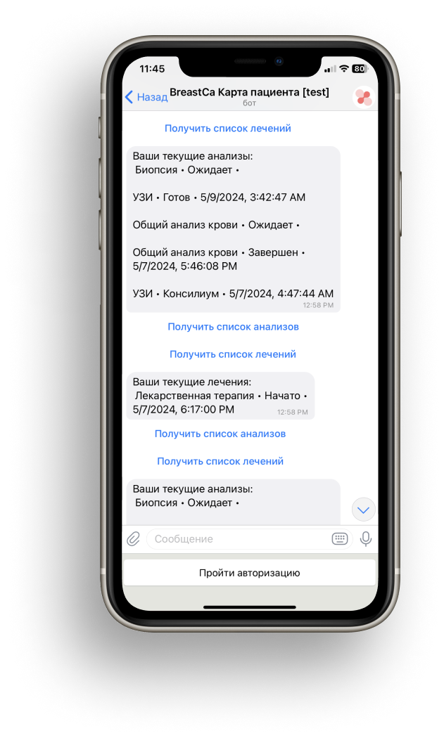 Наш Телеграм-бот обеспечивает мгновенную связь с пациентами , позволяет быстро получать уведомления о важных событиях и изменениях в состоянии пациентов, а также упрощает доступ к ключевой медицинской информации в любое время и в любом месте.